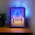 De light box is gemaakt van 7 lagen ragfijn lasergesneden papier geplaatst in een dichte, lichtgrijze, kunststof schaduwdoos. Het geheel is verlicht met flexibele strips met ledlampjes. Formaat: 16 x 21 x 4,5 cm, verpakt in doos van 17 x 28 cm